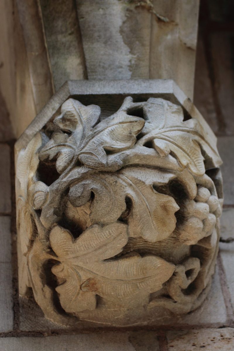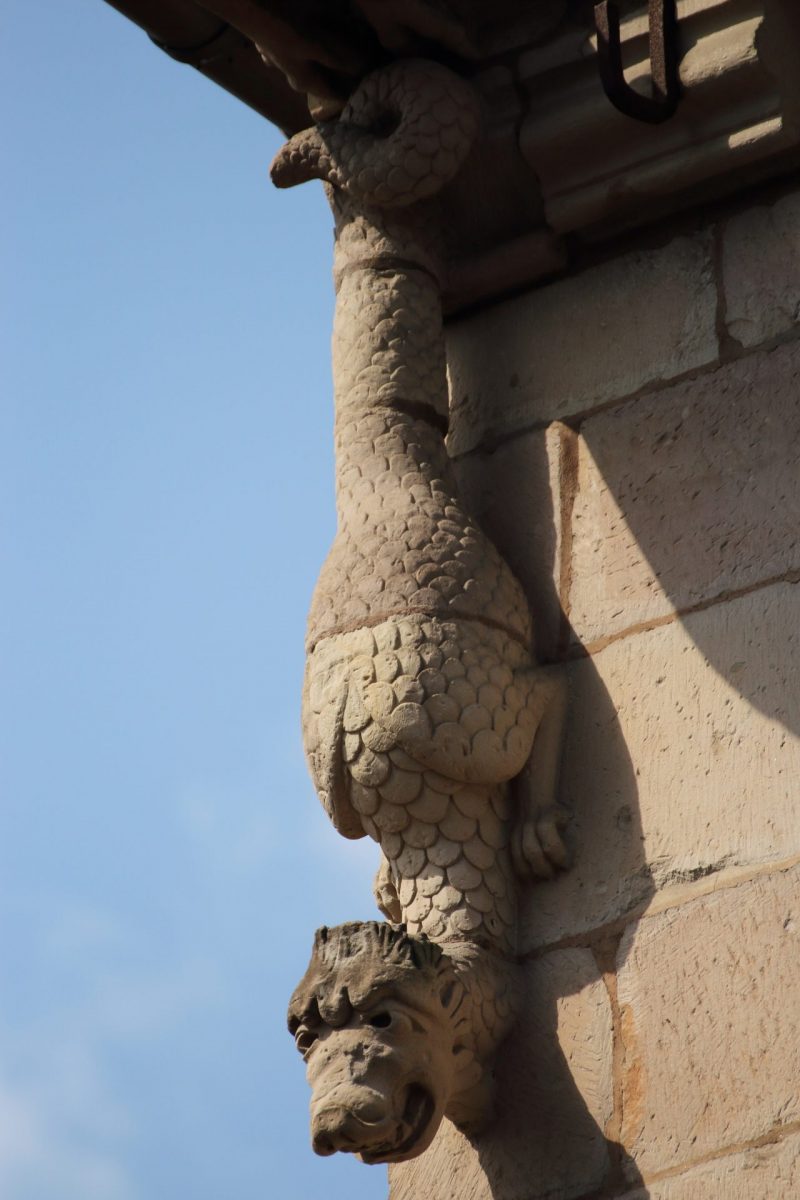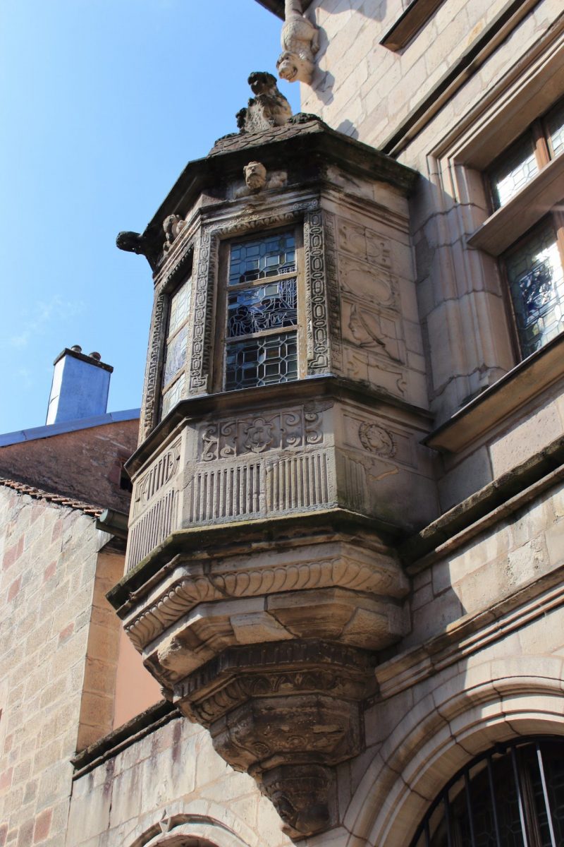 Sur la gauche du balcon, un oriel aux motifs finement ciselés se détache de la façade. Ajouté au XVIe siècle, il témoigne des évolutions architecturales de la Renaissance. Ainsi, les bustes aux figures grotesques et les profils enchâssés dans des médaillons illustrent ces influences antiquisantes.