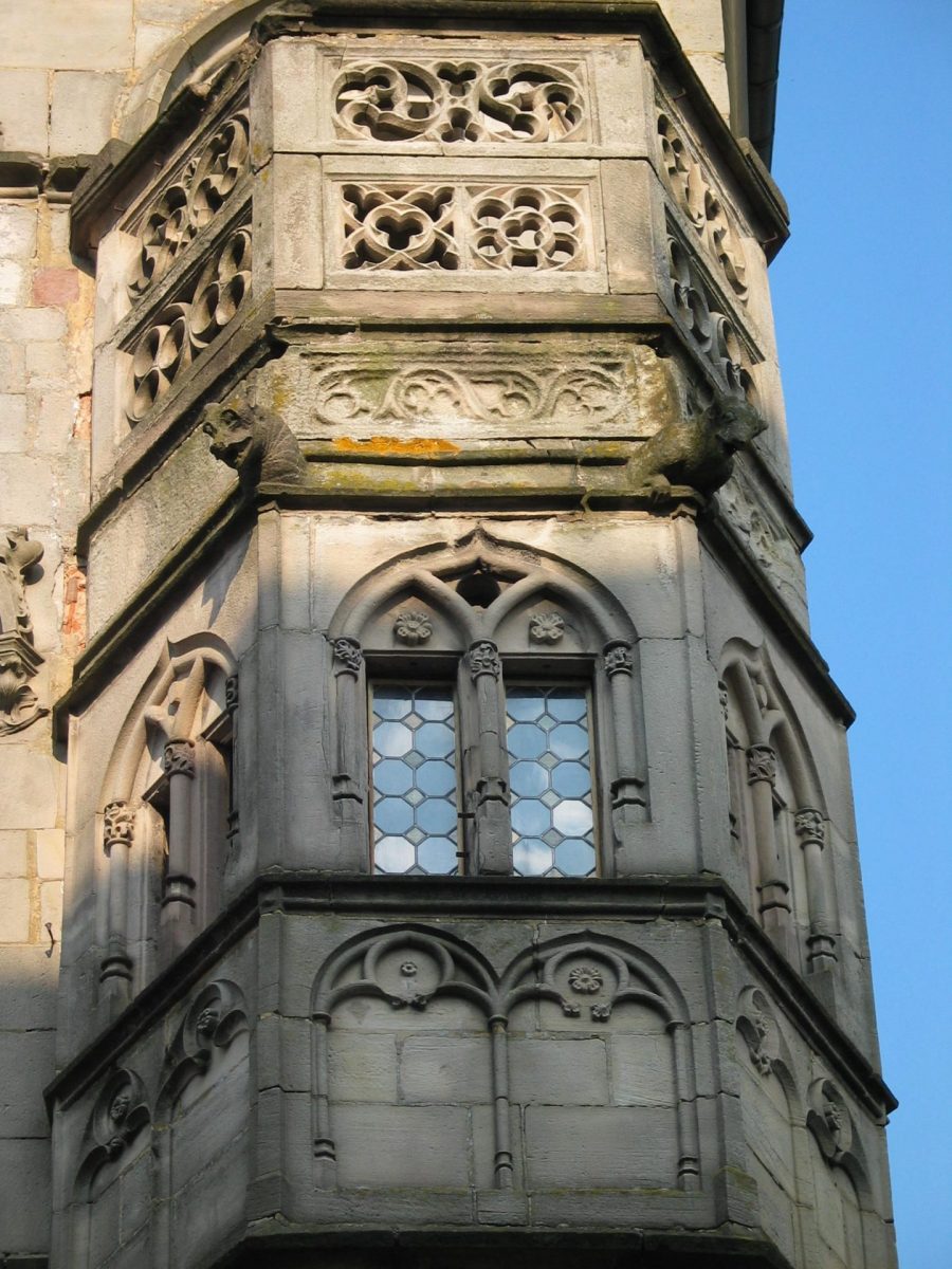 Un balcon intérieur toujours dans le style gothique vous accueille. D’imposantes cheminées ornent chacune des pièces. La plus majestueuse est ornée d’un phylactère reprenant l’Ave Maria, prière qui se déroule ensuite tout au long de la montée de l’escalier à vis. Retrouvez ainsi ces inscriptions qui vous accompagnent au-dessus de chaque fenêtre jusqu’au sommet de la tour.